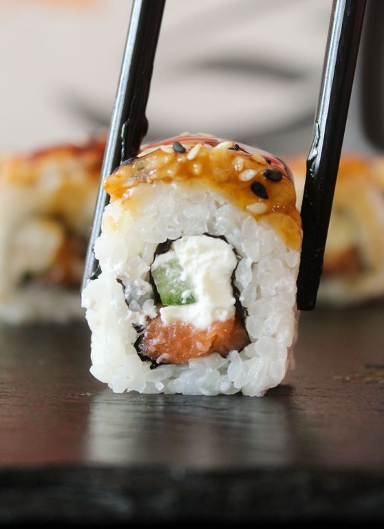 Сливочный сыр, огурец, лосось, копченый угорь.,соус унаги,кунжут. 240гр
