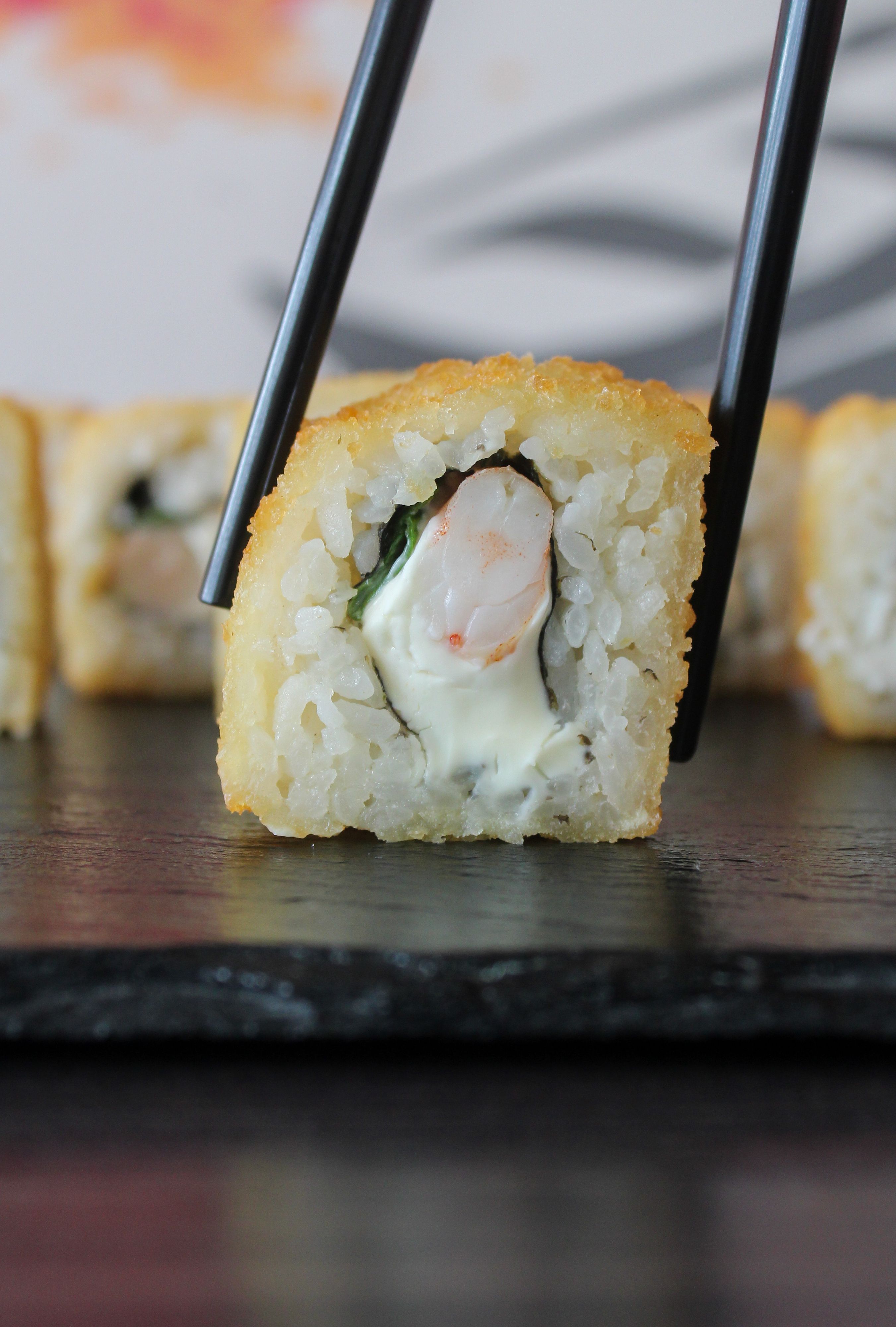 Темпурный ролл с тигровой креветкой, сливочным сыром и зеленым луком