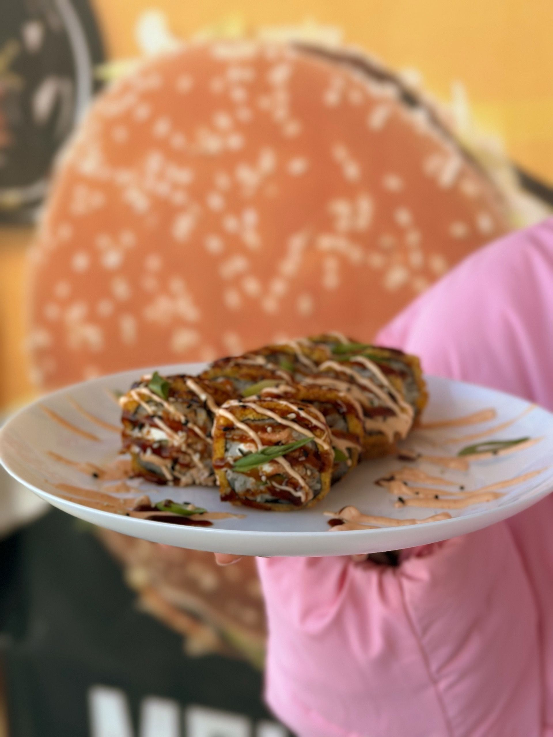 В составе : рис, нори, сыр сливочный, лосось терияки, огурец, спайси соус, Унаги соус , кунжут, лук зелёный , панировочные сухари .