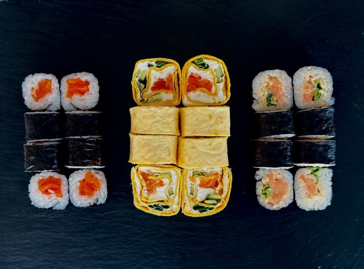 тортилья с копченым лососем, ролл с лососем, ролл со спайси соусом и копченым лососем
