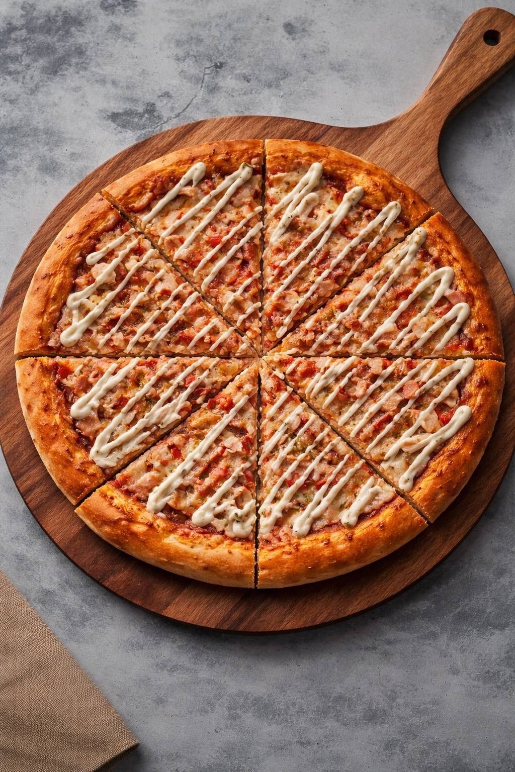 курица ветчина, кетчуп, болгарский перец, моцарелла, соус цезарь, томатный соус, соленый огурец